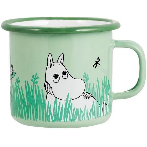 Beautiful green Moomin mug featuring Moomintroll, Sniff and Snufkin. Muurla combines design and durability in this beautiful Moomin enamel mug. They are suitable not only for traditional table setting but also for any kind of outdoor use - including hiking, cottage and boat. Cheer up your coffee and tea moments! Volume 2,5 dl. Machine washable.
