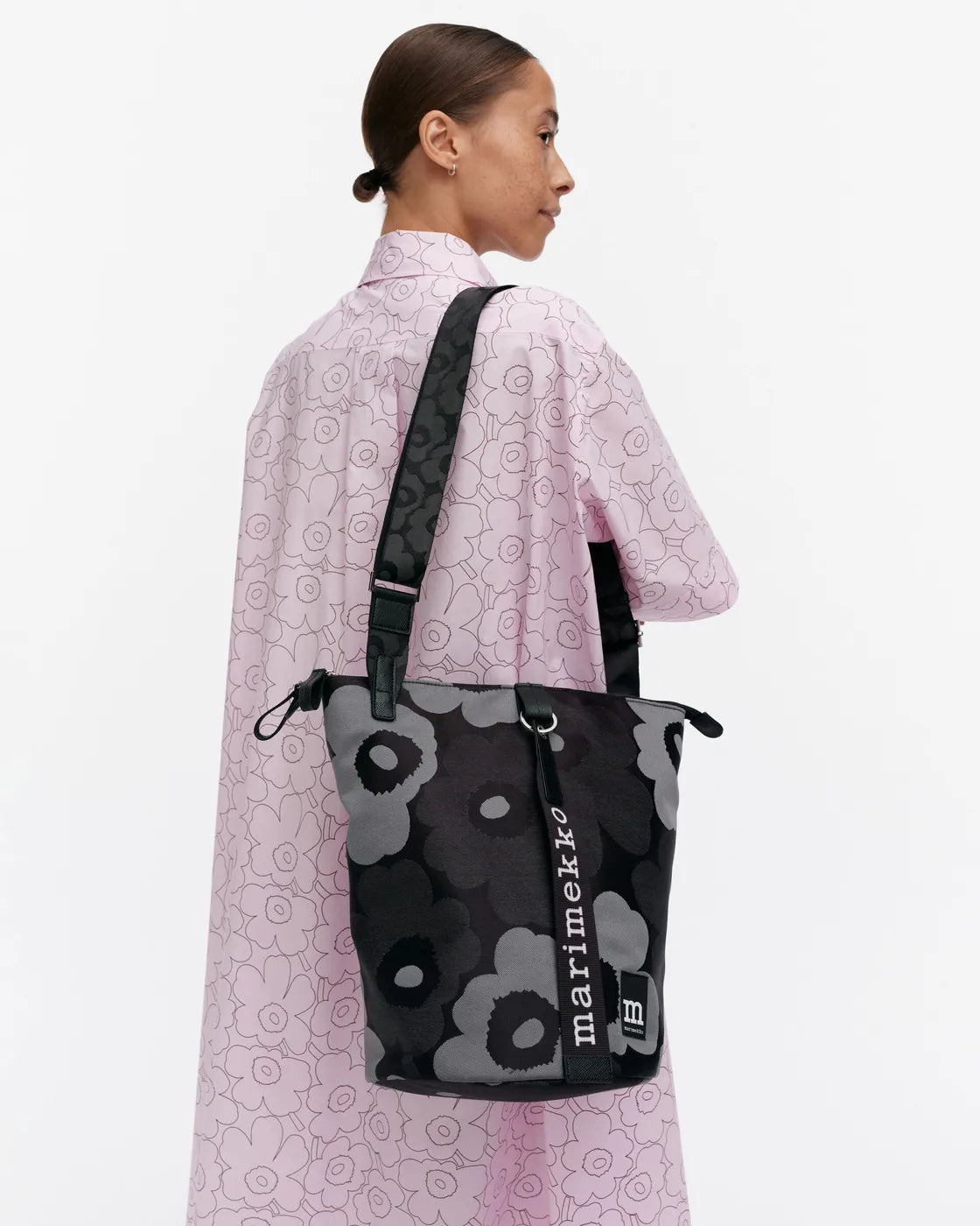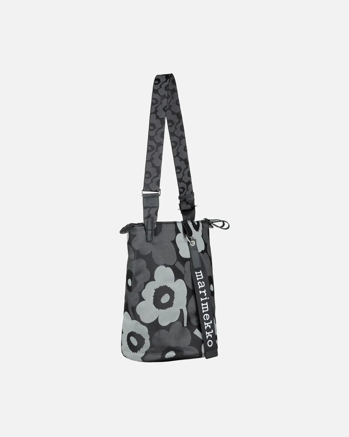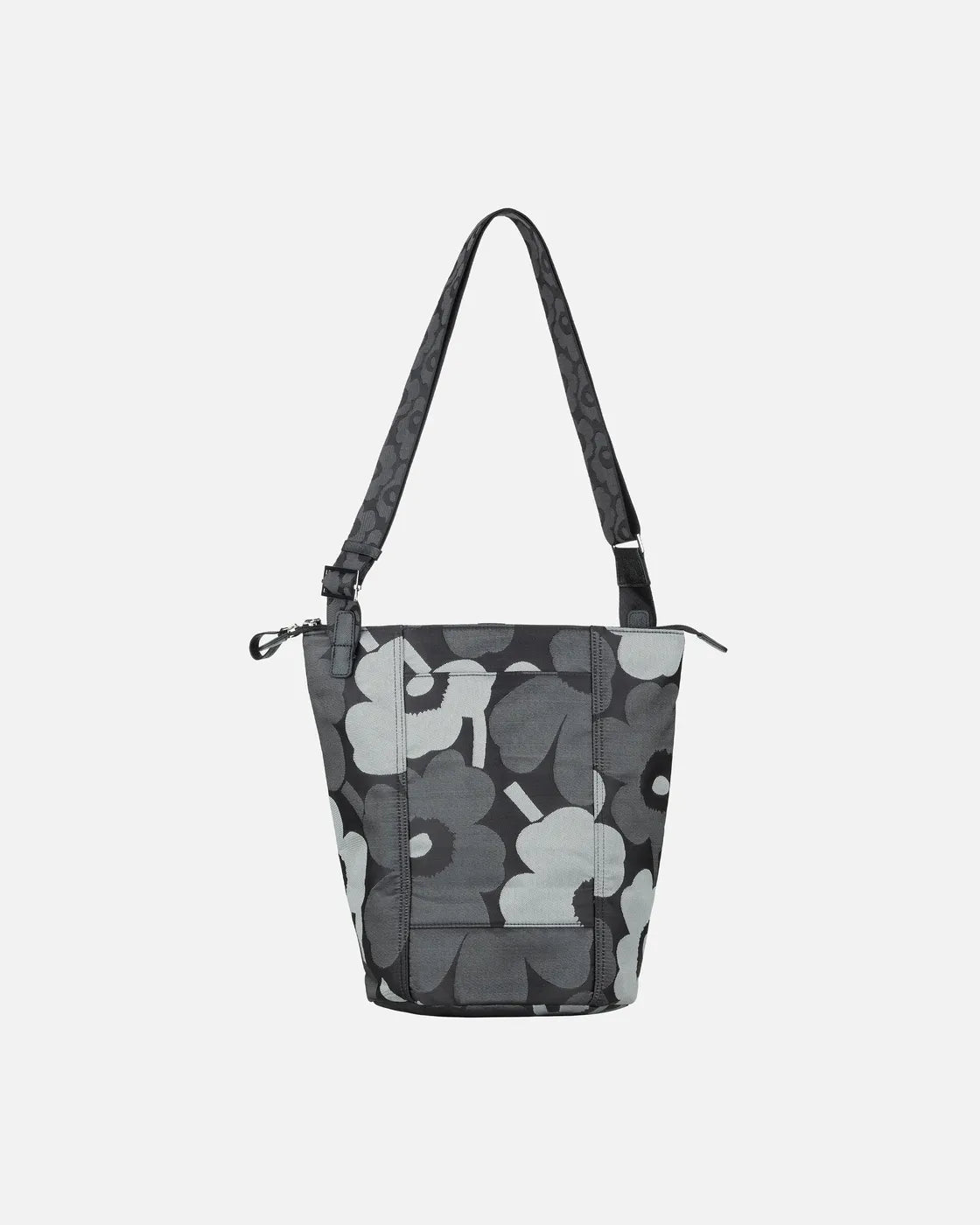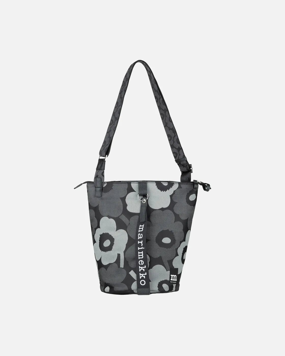 The All Day Bucket shoulder bag is made of recycled polyester with the jacquard knit Unikko pattern. The bag has three compartments: one with a zipper closure, one plain open compartment, and one open compartment with an inside pocket. The adjustable shoulder strap has the jacquard knit Unikko pattern.The front features the Marimekko keychain and there is a slip-in pocket in the back, which closes with a magnetic button.