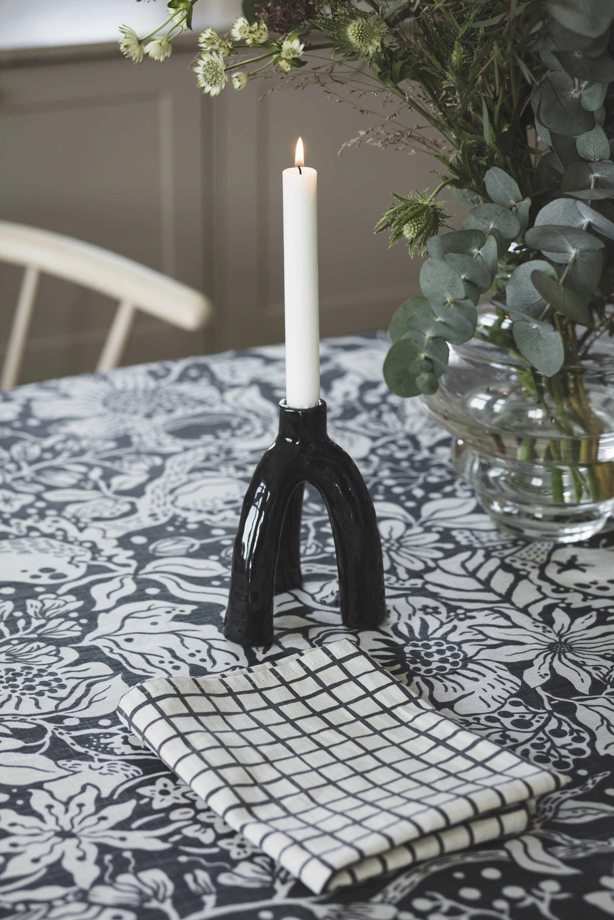 Tablerunner Äppelpäppel. A pattern with gnarled branches, apple blossoms, mysterious hides and small animals.