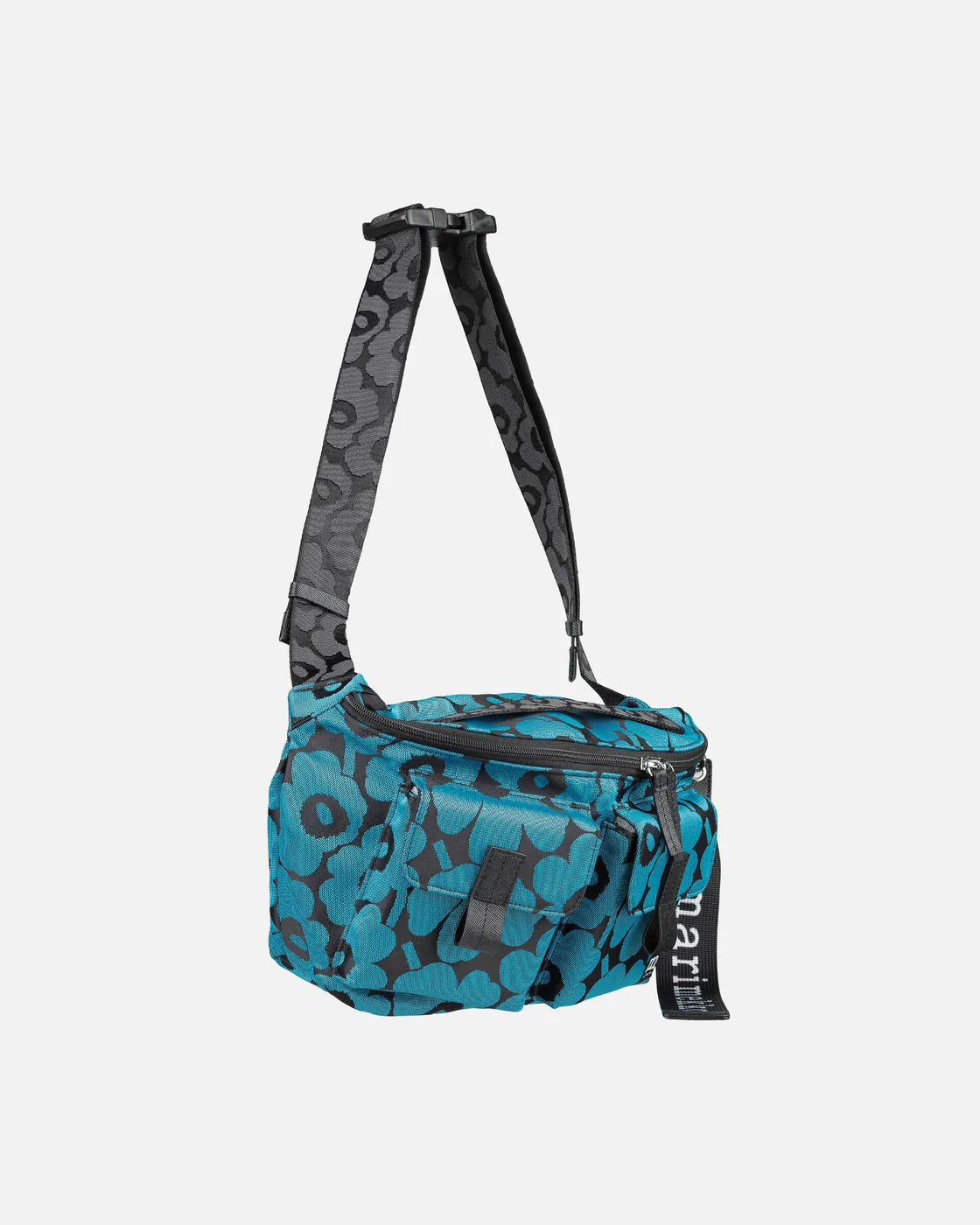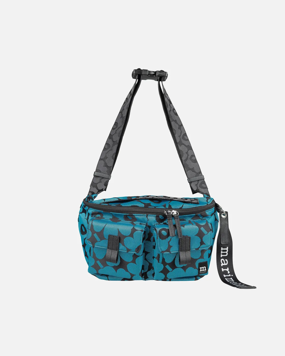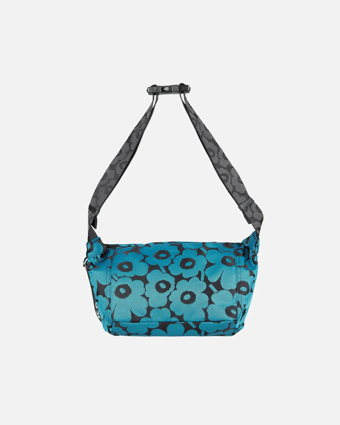 The Sling Bag M crossbody features the jacquard knit Unikko pattern. The bag has a zipper closure, a handle, and an adjustable shoulder strap with a buckle, both with the jacquard knit Unikko pattern. There are two flap pockets in the front with magnetic closures, a zipper pocket on the inside, and a back outside pocket that closes with a magnetic button. The Marimekko keychain is attached to the front.
