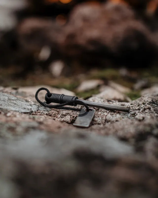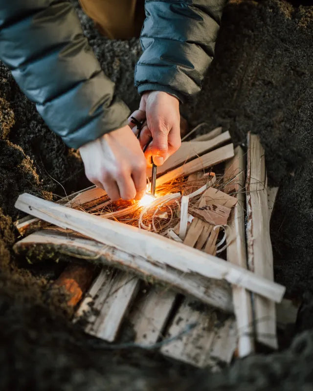 Just pull the striker or the back of your knife firmly down the length of the stick and direct the sparks towards you tinder. Any dry material like wood chips and moss will do the trick. Enjoy your campfire!