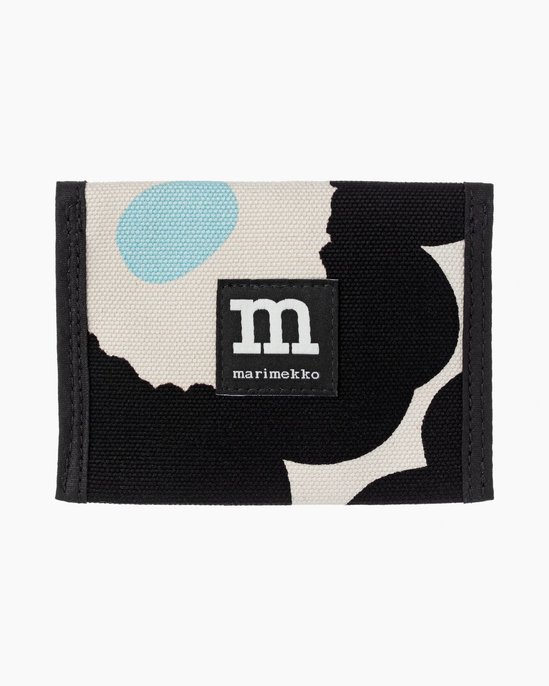 The Juolukka wallet is made of cotton canvas in the Pieni Unikko pattern, which is printed in Helsinki. The wallet has a zipper pocket and an open pocket on the inside and a snap button closure. The Marimekko logo is featured on the back.