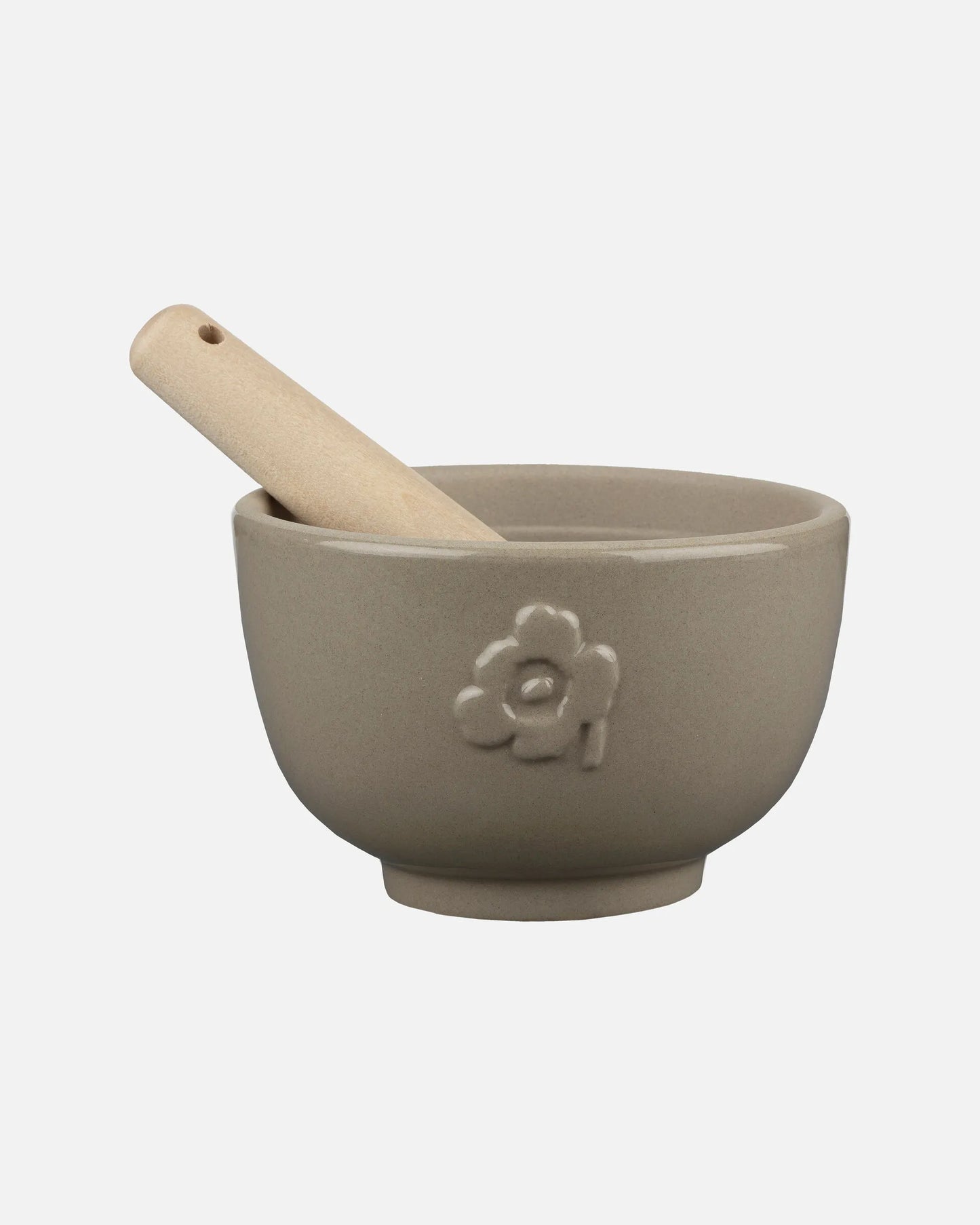 Made of brown stoneware, this mortar has a clear glaze and the embossed Unikko pattern poppy flower on the outside. The naturally rough inside features grooves to help with grinding. The pestle is made of rubber wood and we recommend washing it by hand. The mortar is dishwasher safe. This product is packed in a gift package.