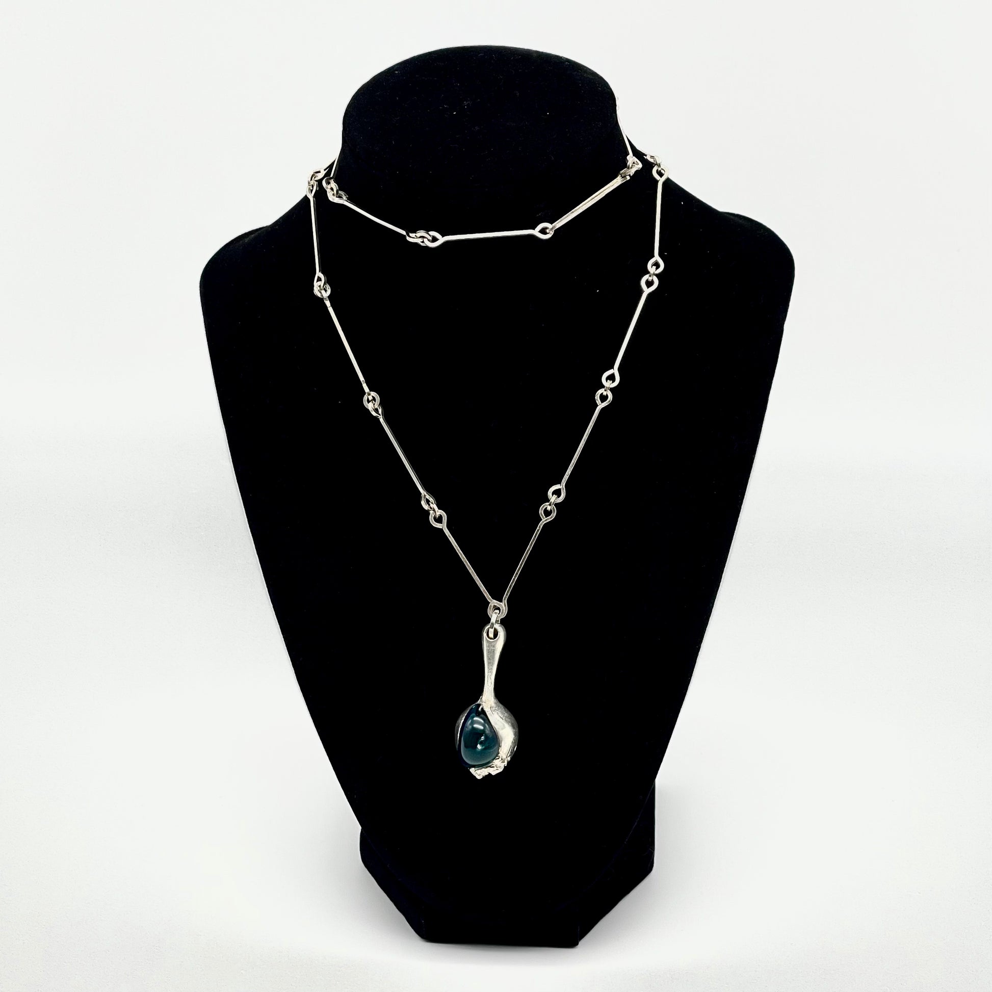 Designed in 1974 by celebrated Finnish jewelry designer Björn Weckström for Lapponia, the Nectaris necklace is a bold and iconic example of Finnish modernist design. Crafted in 925 sterling silver and accented with a translucent acrylic element, the piece reflects Weckström’s signature blend of sculptural form, futuristic influence, and Nordic minimalism.