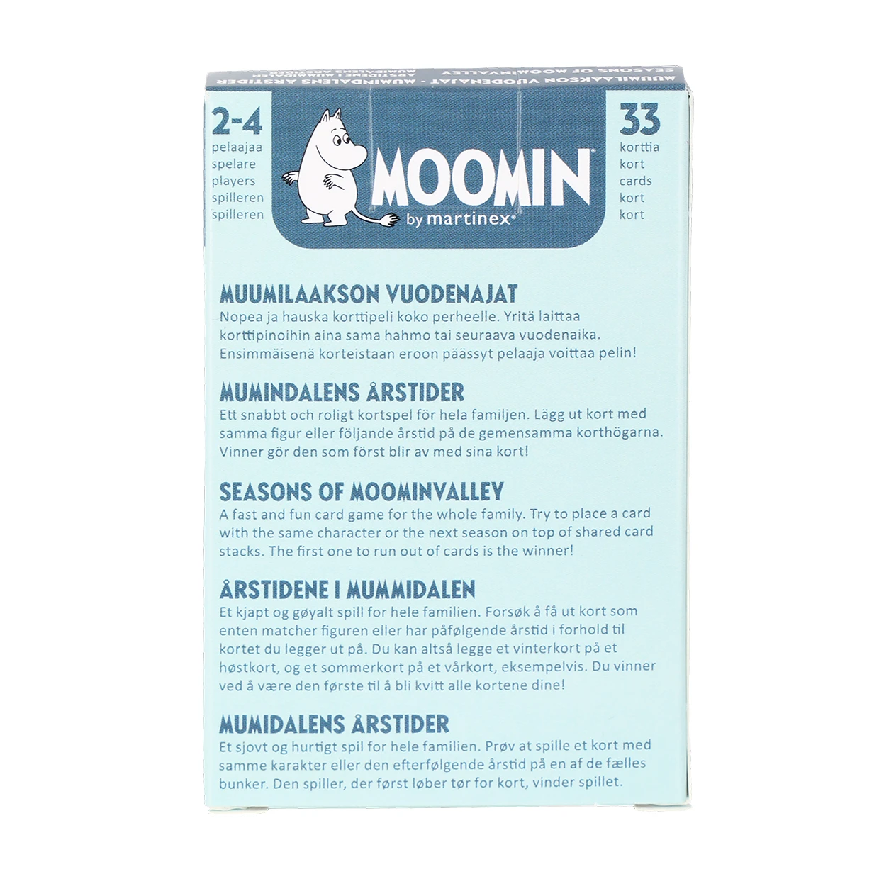 SEASONS OF MOOMINVALLY: A fun and fast card game for the whole family. Try to place a card with the same character or the next season on top of shared card stacks. The first one to run out of cards is the winner!