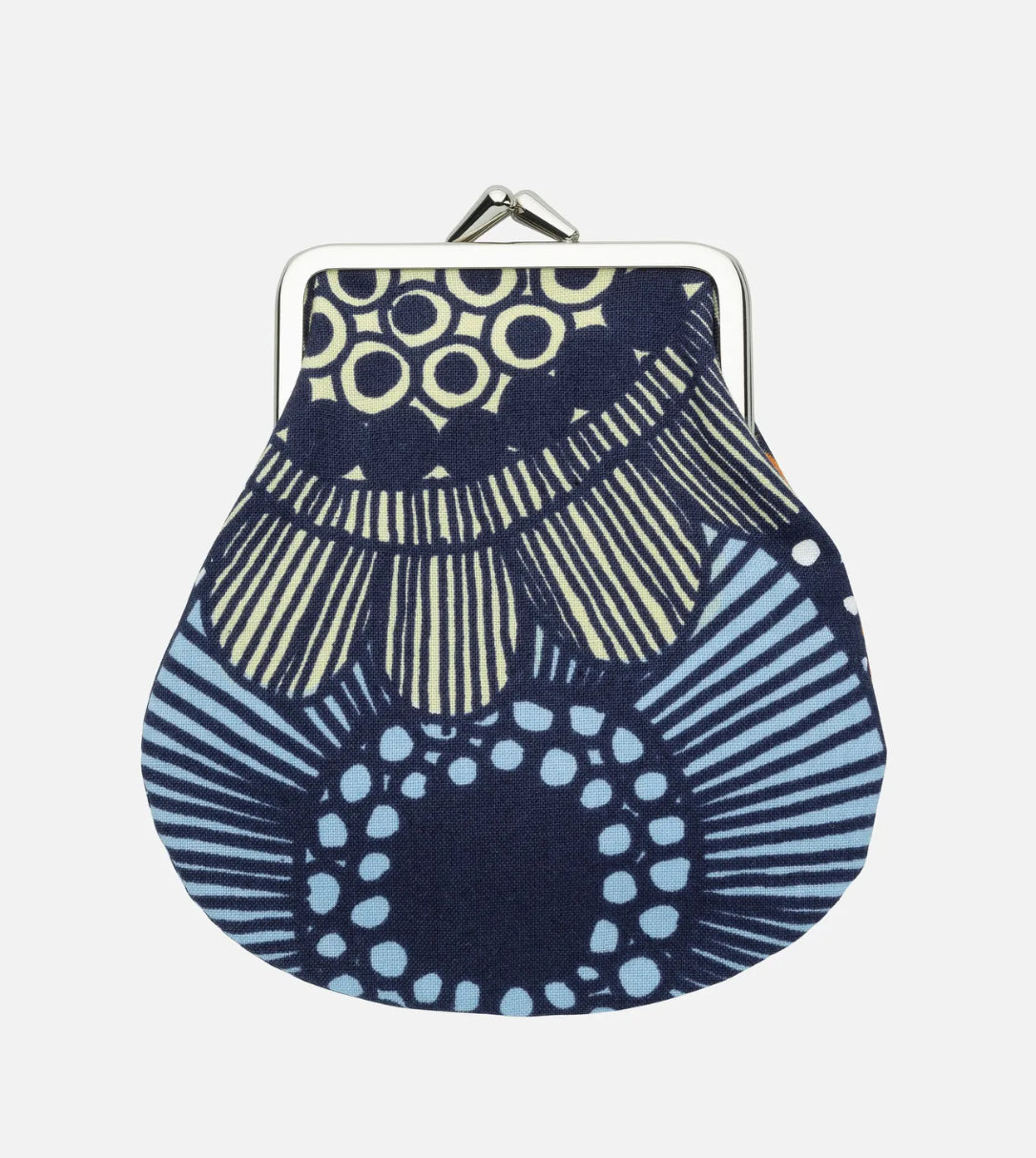 Made of unbleached cotton, the Pieni Kukkaro purse is a multipurpose classic. This purse is ideal for cards and other small things. It has a metallic frame that is easy to snap open and shut. This purse features Pieni siirtolapuutarha pattern. The material is printed in Helsinki.