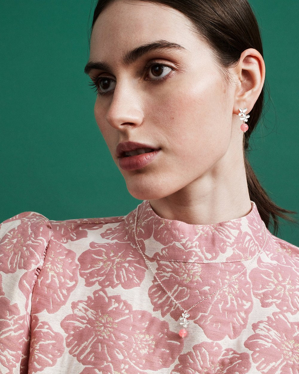 Frail silver buds, strong together. The Pink Ribbon Silver pendant is adorned with a Finnish glass bead, handmade in Helsinki by glass artist Niina Halonen. Oval pea chain, adjustable length 45/50 cm. Spring ring clasp.