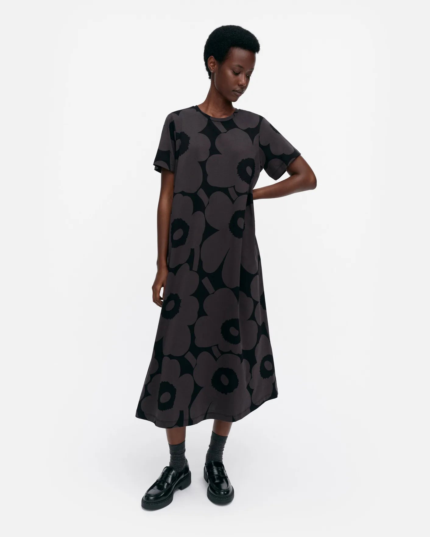 The Pisteinen t-shirt dress is made of organic cotton jersey and it has a slim, A-line fit. The dress features the Unikko pattern, an O-neck with a self-fabric finish, and a central seam in the back.