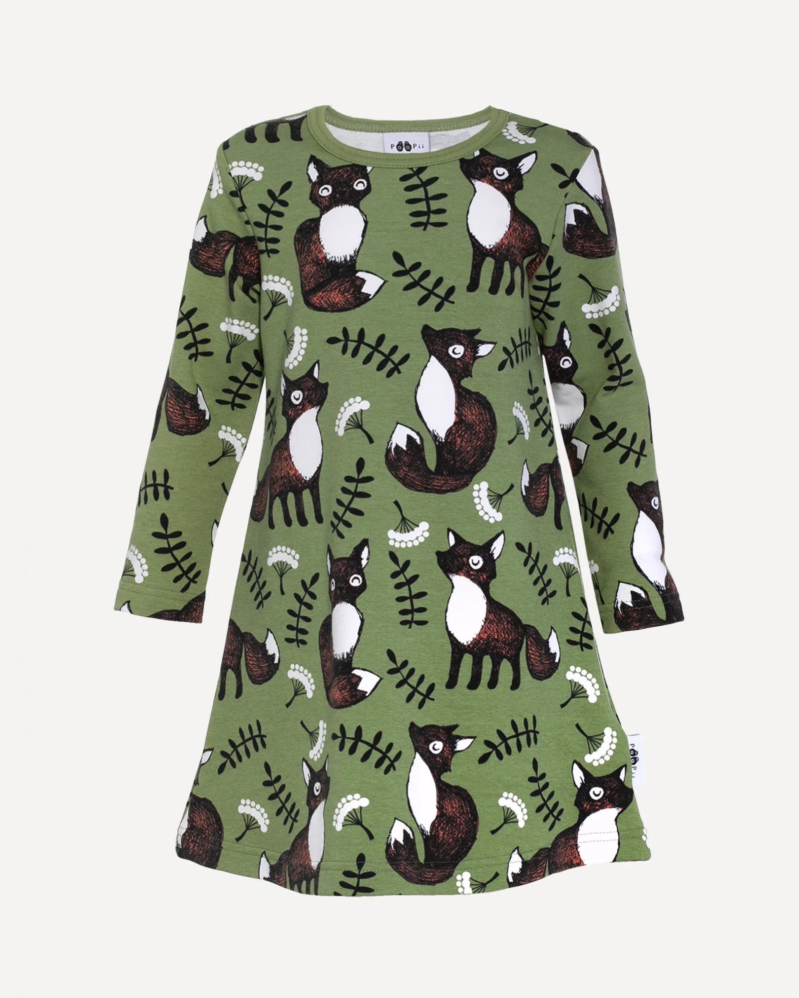 Paapii's green Sara sweatshirt dress, in a shade called fen. The fox pattern called Nuutti, is one of Paapii's most beloved patterns. In the pattern, an expressive fox admires rowan berries. The name "Nuutti" signifies pride or briskness, reflecting the character traits of the fox.