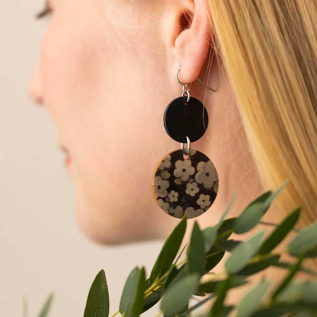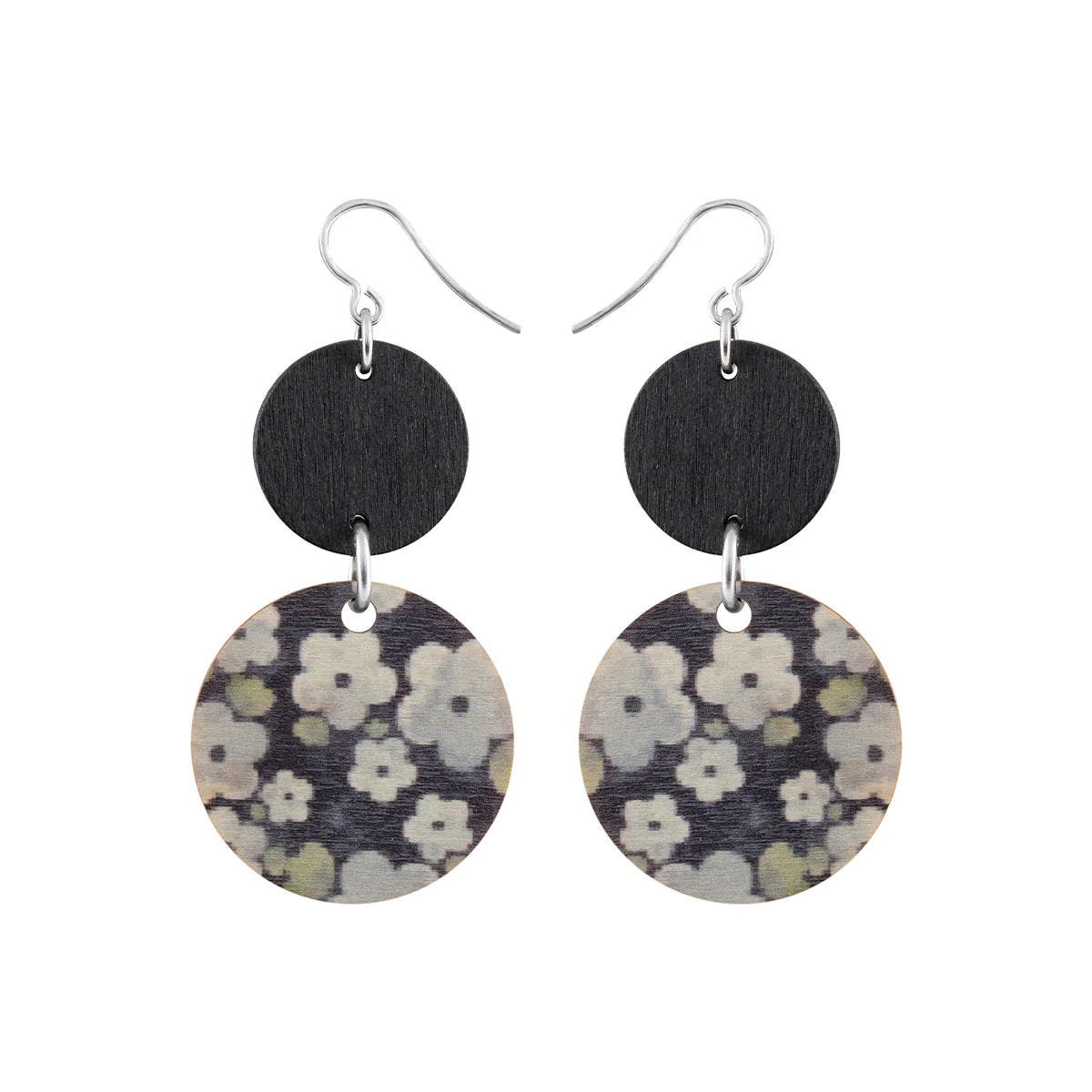 Soliseva earrings have two round, different-sized wooden disks, one with the forget-me-not print. They are easy to use and to combine with other Aarikka collections.